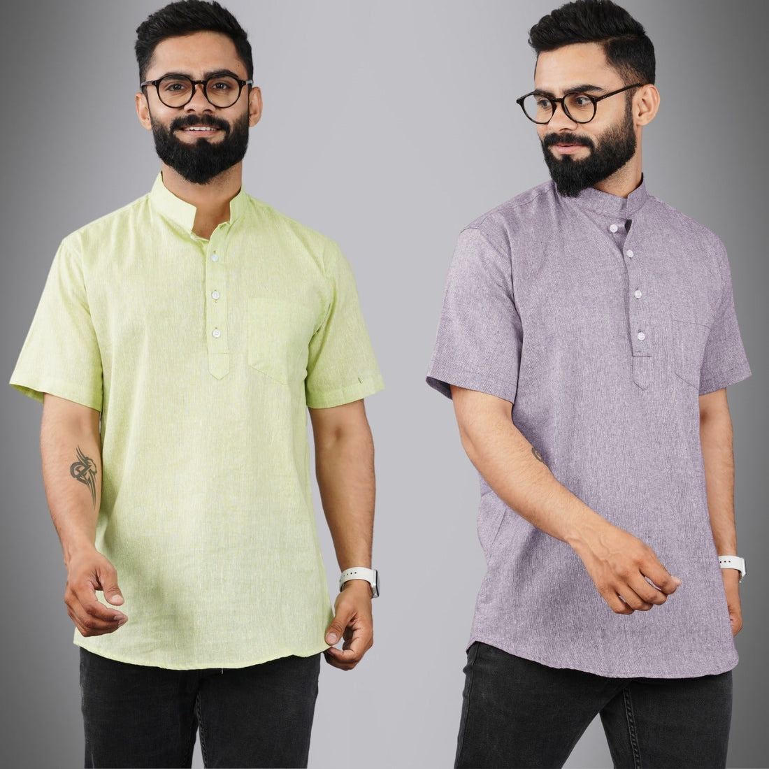 Pack Of 2 Mens Regular Fit Parrot Green And Purple Half Sleeve Cotton Short Kurta Combo
