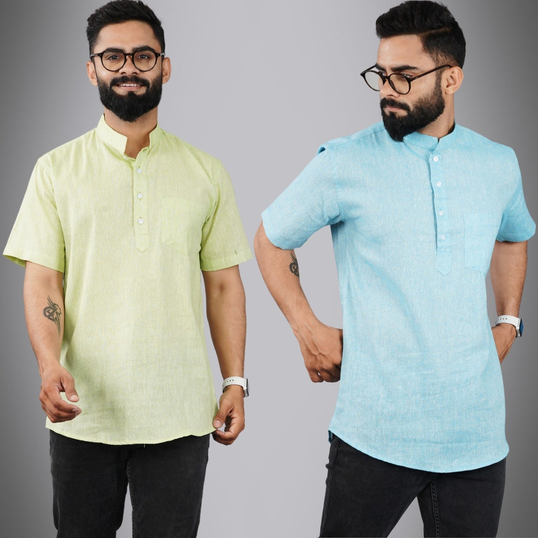 Pack Of 2 Mens Regular Fit Parrot Green And Sky Blue Half Sleeve Cotton Short Kurta Combo