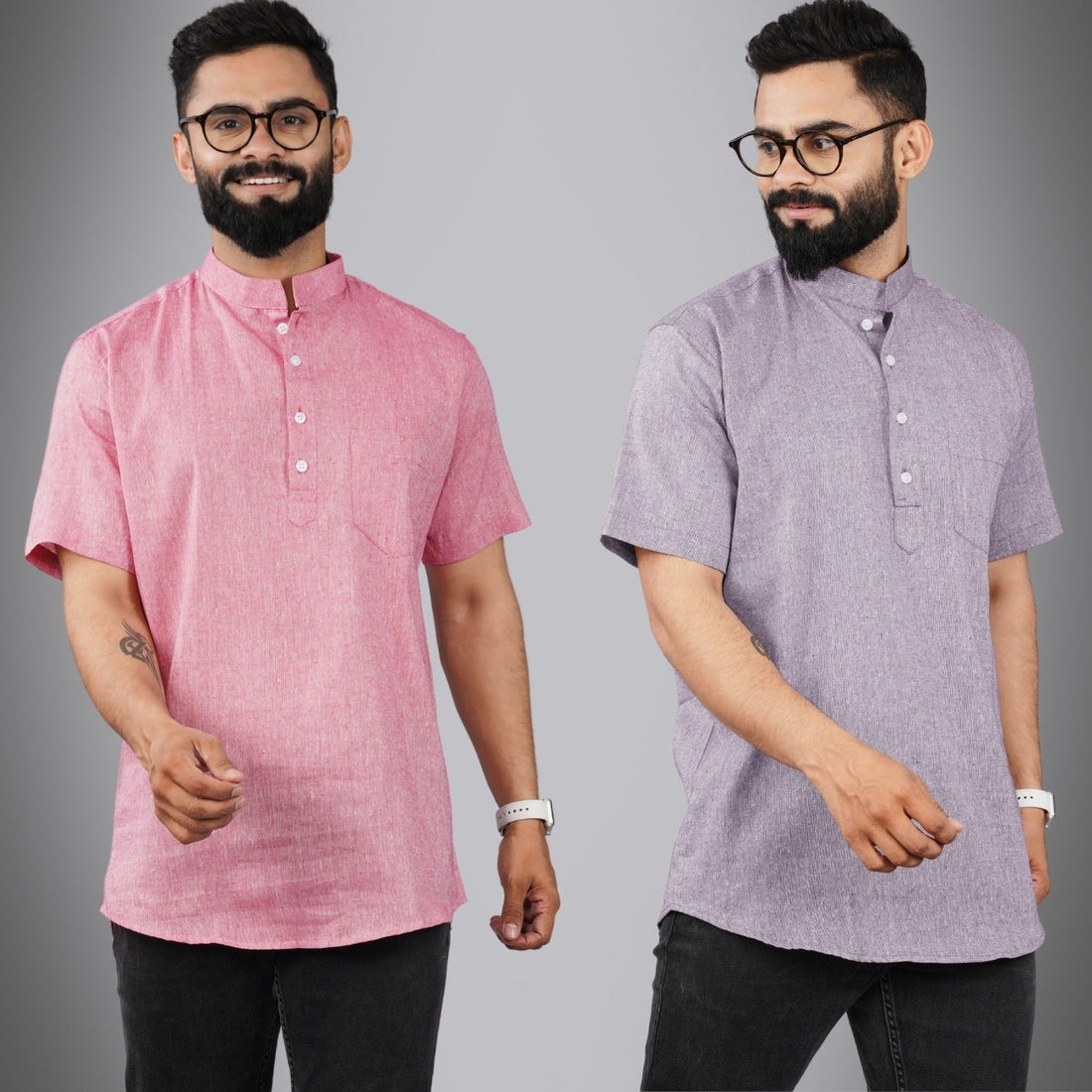 Pack Of 2 Mens Regular Fit Pink And Purple Half Sleeve Cotton Short Kurta Combo