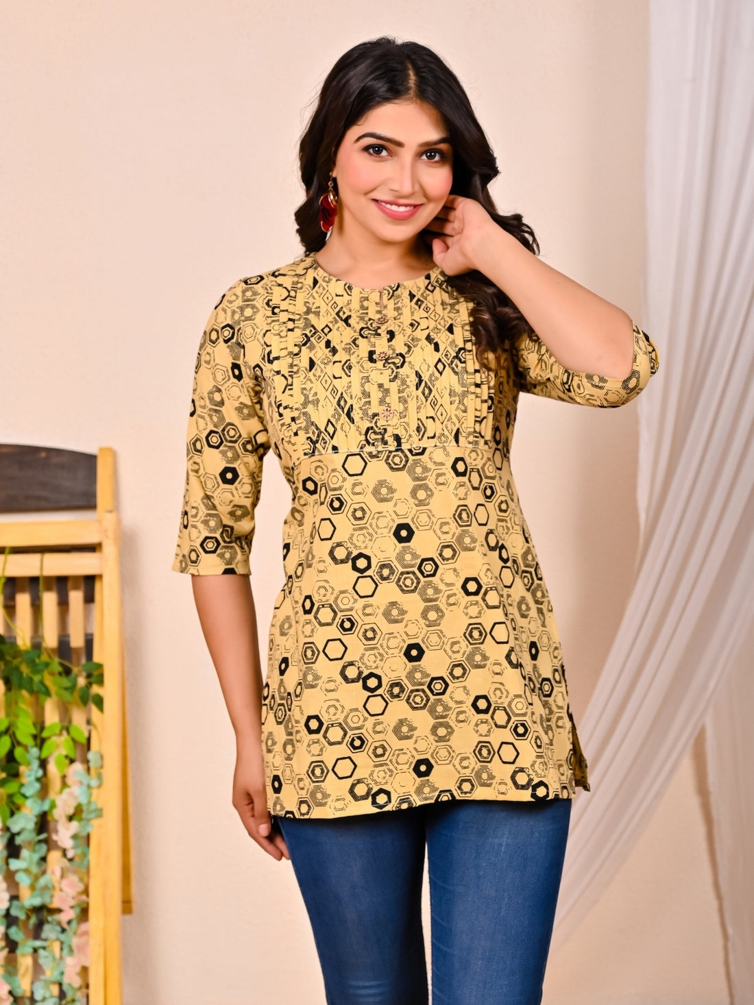 Find this chic women's regular-fitting printed cotton short kurti/top; it's ideal for parties and casual...