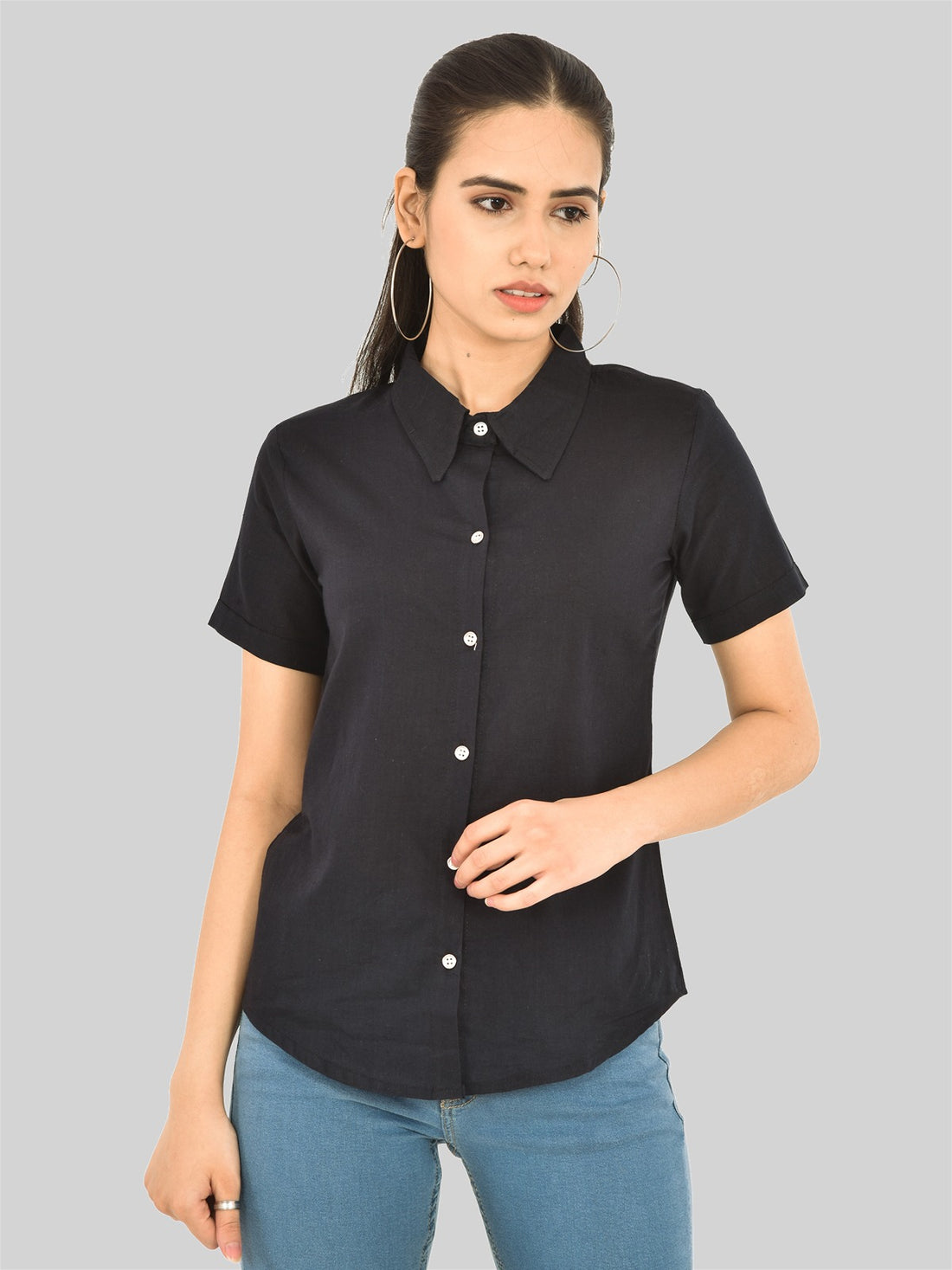 Womens Solid Black Cambric Cotton Shirt