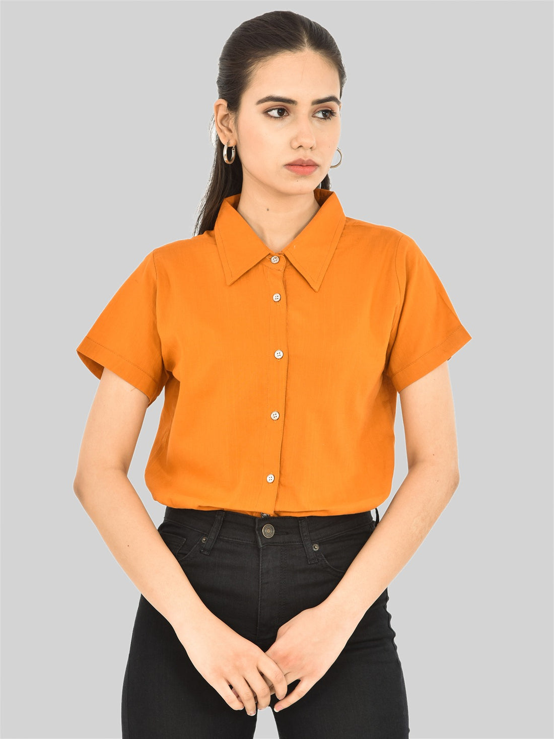 Women Solid Mustard Half Sleeve Spread Collar Cotton Shirt