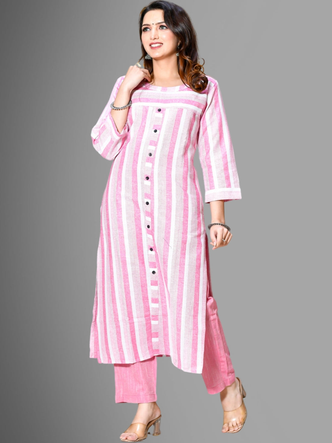Womens Pink Khadi Cotton Multistripe Straight Kurti