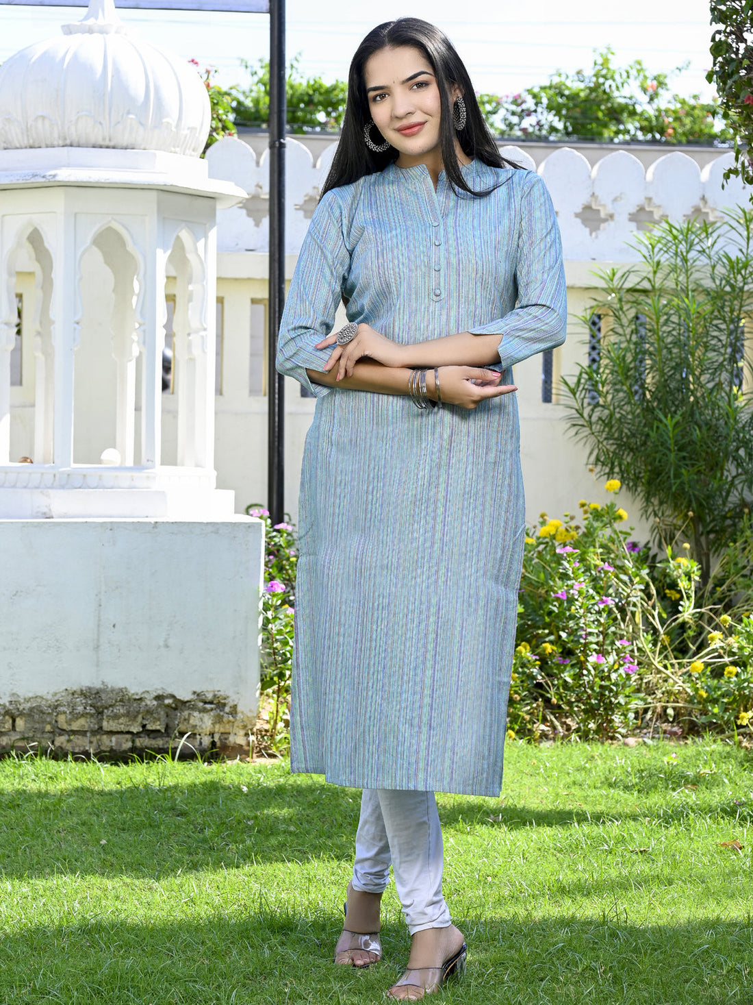 Womens Blue Khadi Cotton Multistripe Straight Kurti