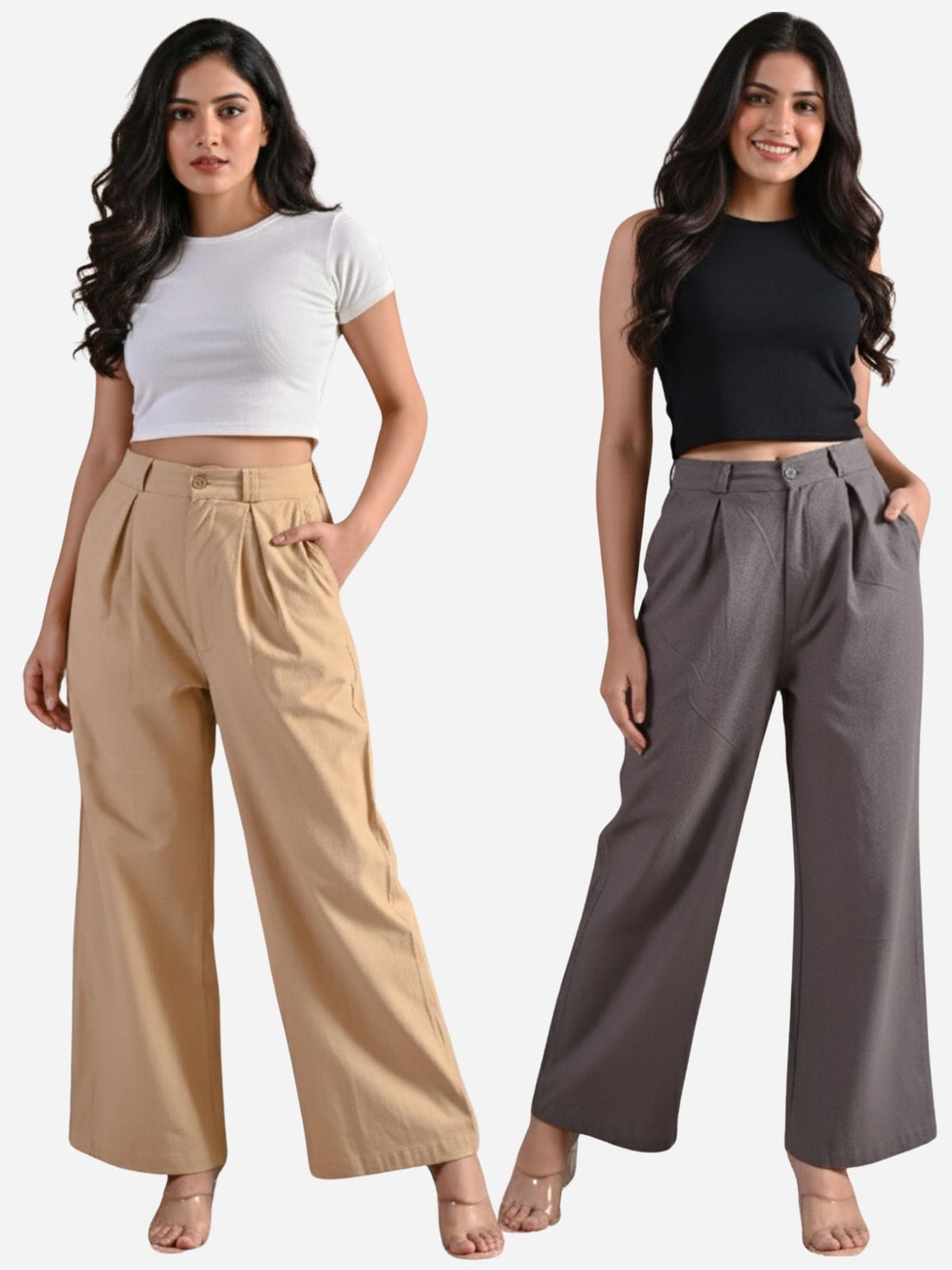 Pack Of 2 Beige And Grey Women Cotton Wide Leg Pants