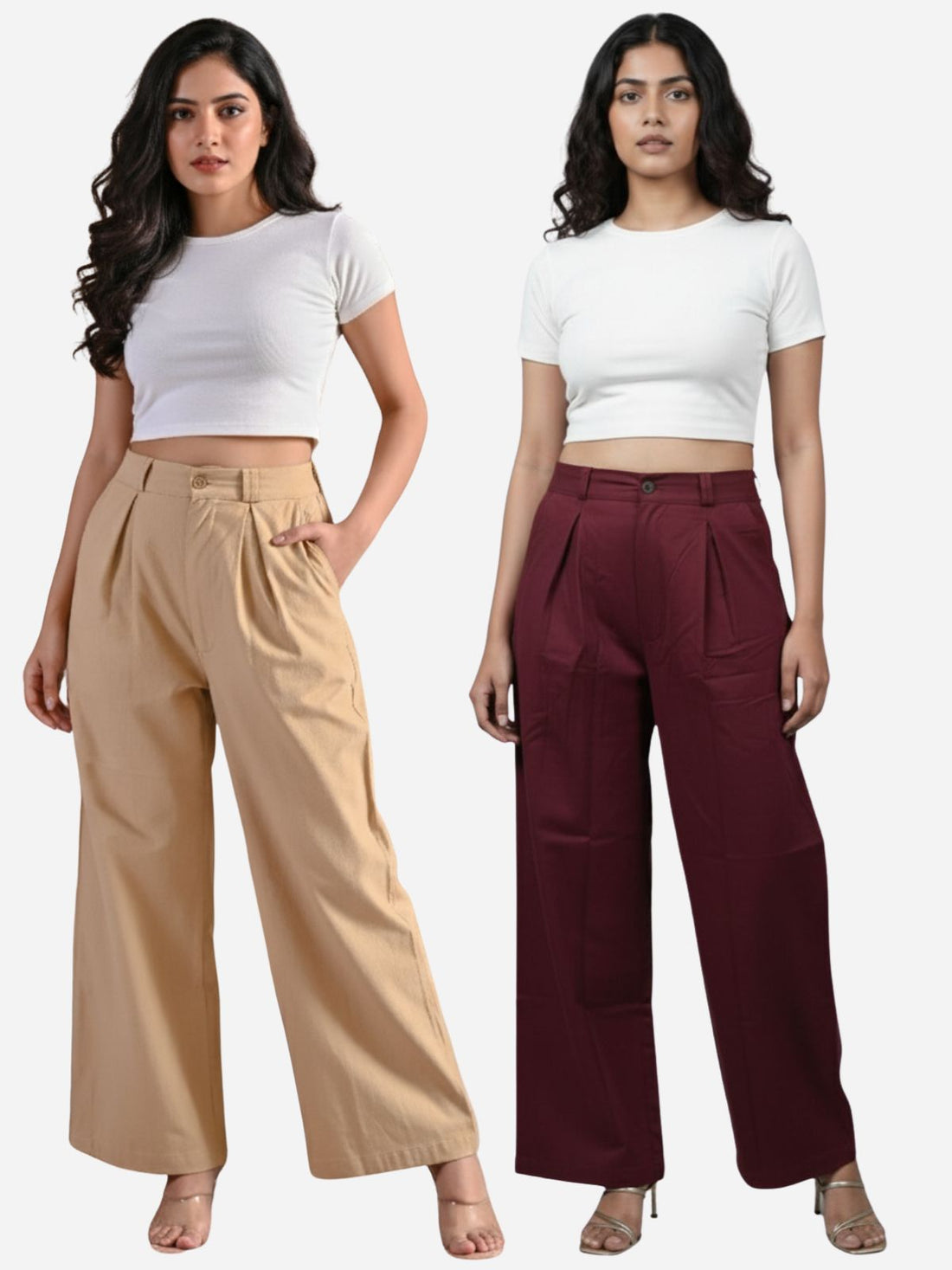 Pack Of 2 Beige And Wine Women Cotton Wide Leg Pants