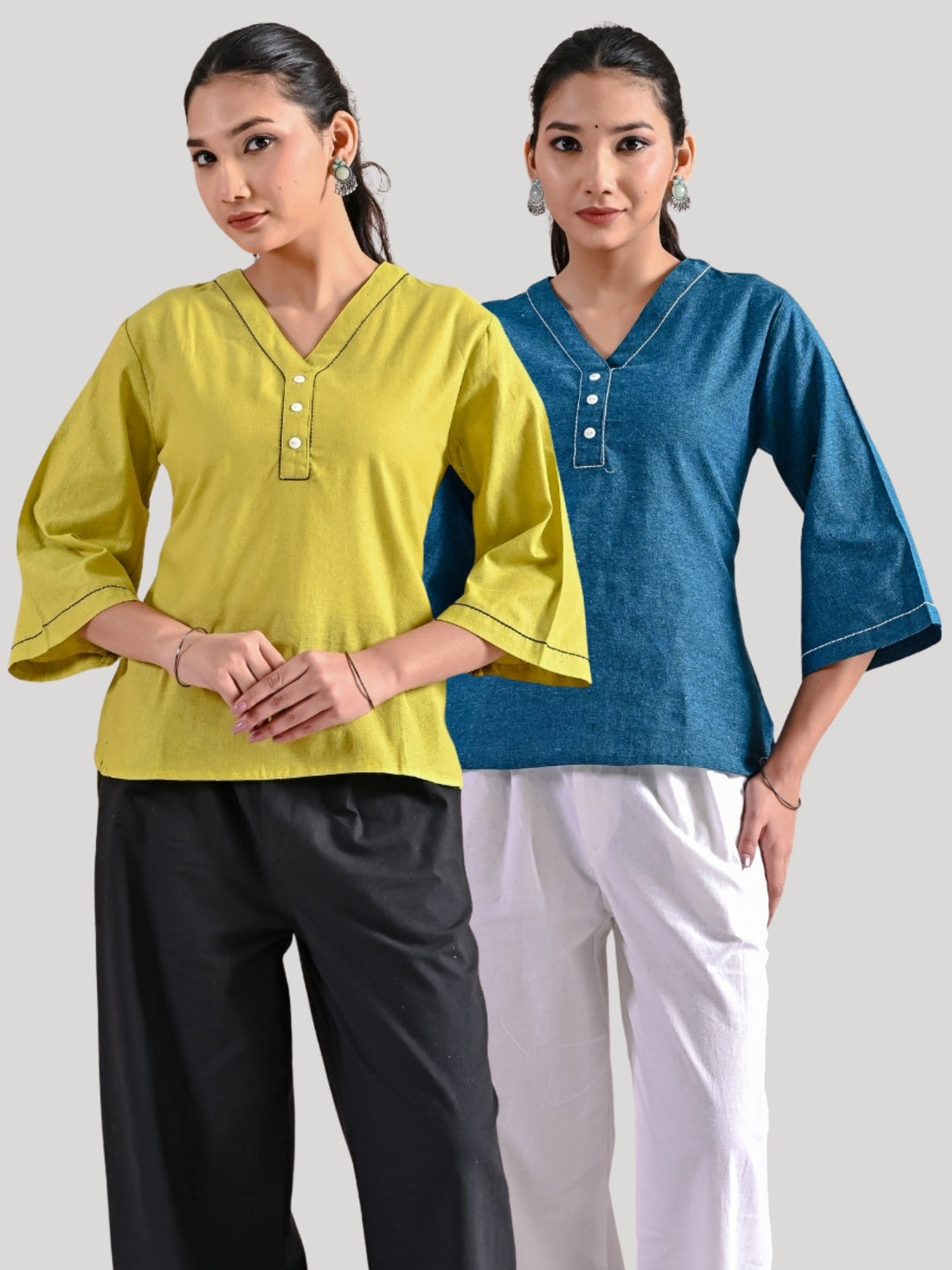 Pack Of 2 Mustard And Teal Blue Handloom Cotton Anchor Thread Designer Tops