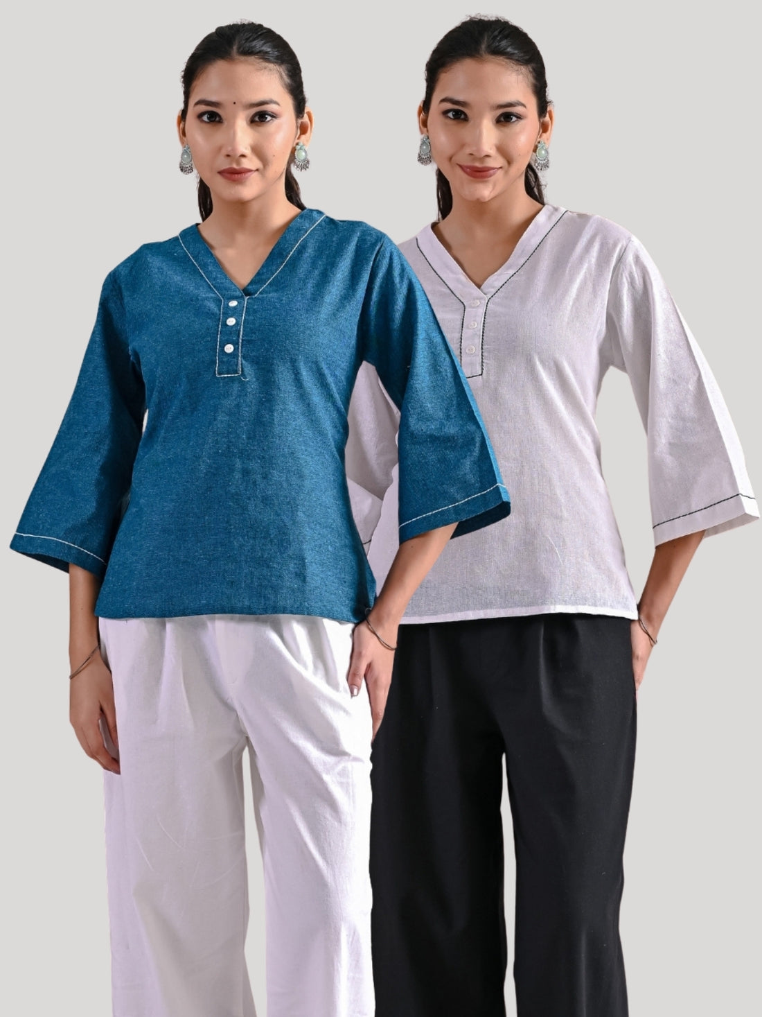 Pack Of 2 Teal Blue And White Handloom Cotton Anchor Thread Designer Tops