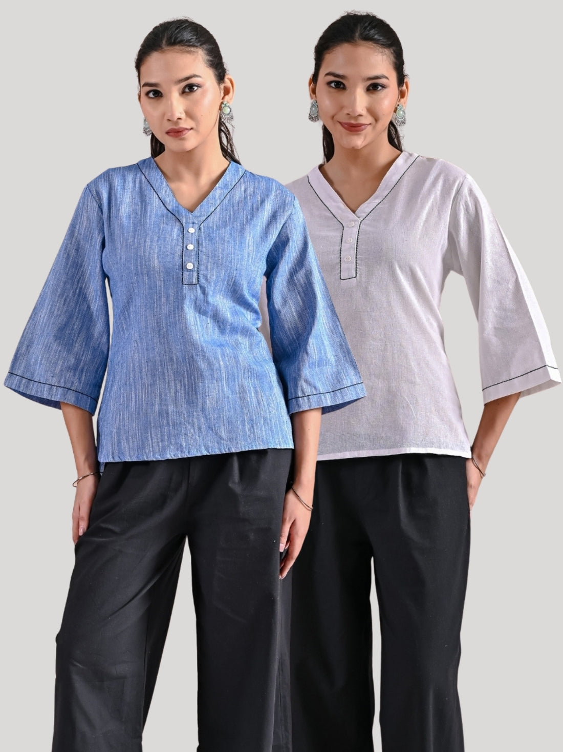 Pack Of 2 Denim Blue And White Handloom Cotton Anchor Thread Designer Tops