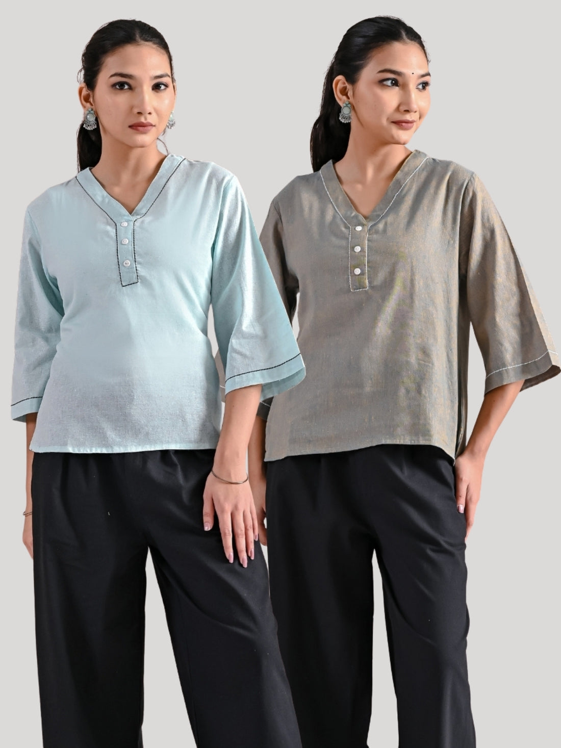 Pack Of 2 Denim Blue And Teal Blue Handloom Cotton Anchor Thread Designer Tops