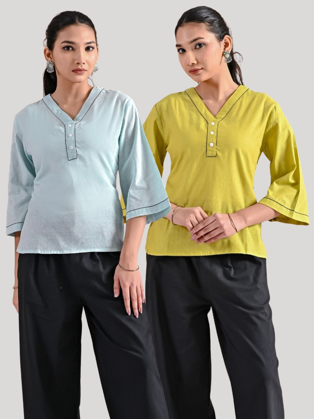 Pack Of 2 Mustard And Parrot Green Handloom Cotton Anchor Thread Designer Tops