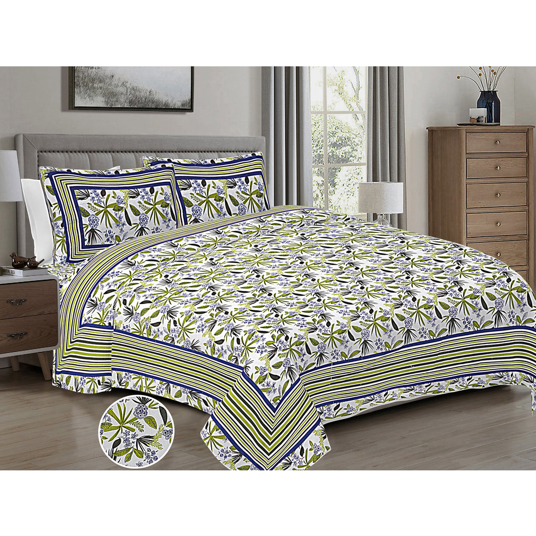 Jaipur Sanganer Print King Size Double Bedsheet,Green,1002-2