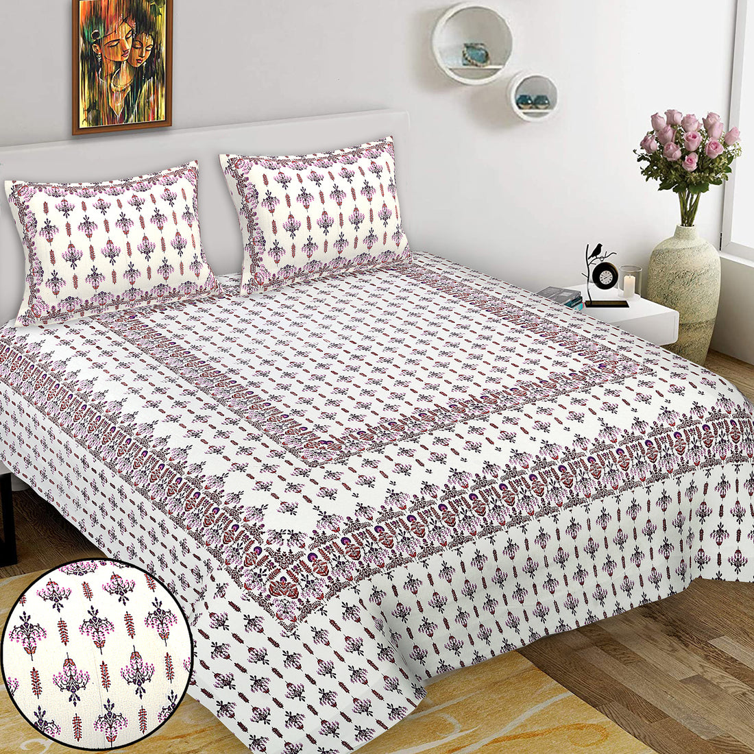 Jaipur Sanganer Print King Size Double Bedsheet,Pink,1005-1