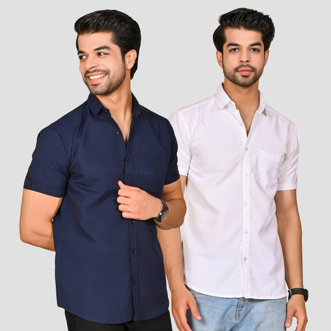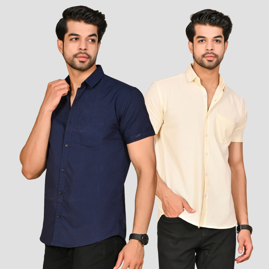 Navy Blue And Cream Half Sleeve Linen Shirt Combo