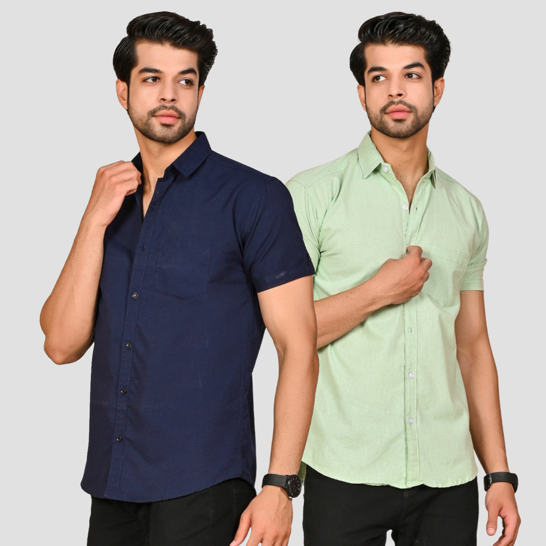 Navy Blue And Green Half Sleeve Linen Shirt Combo