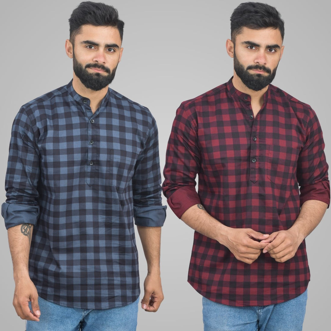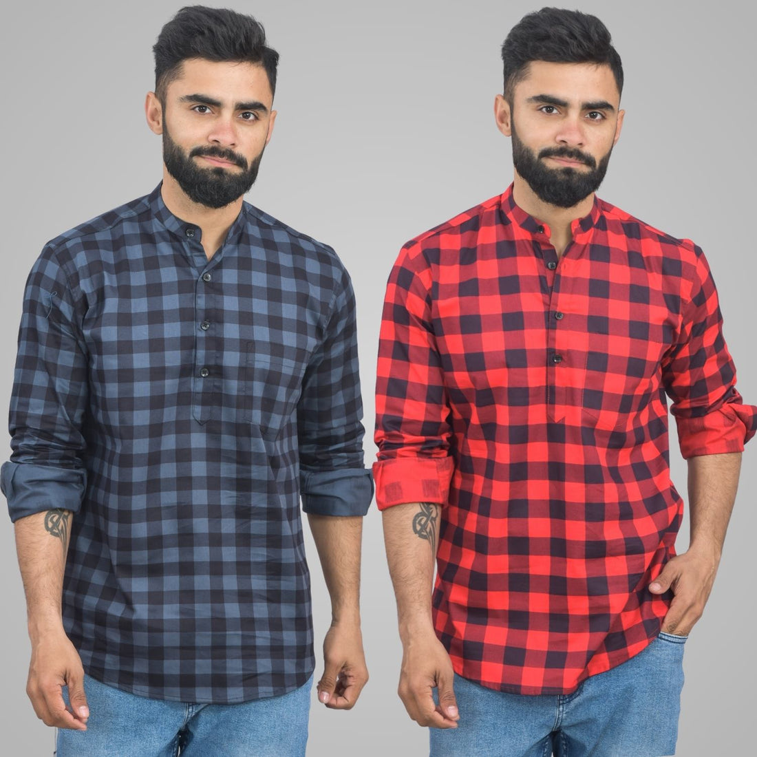 Pack Of 2 Mens Blue And Red Check Cotton Short Kurta Combo