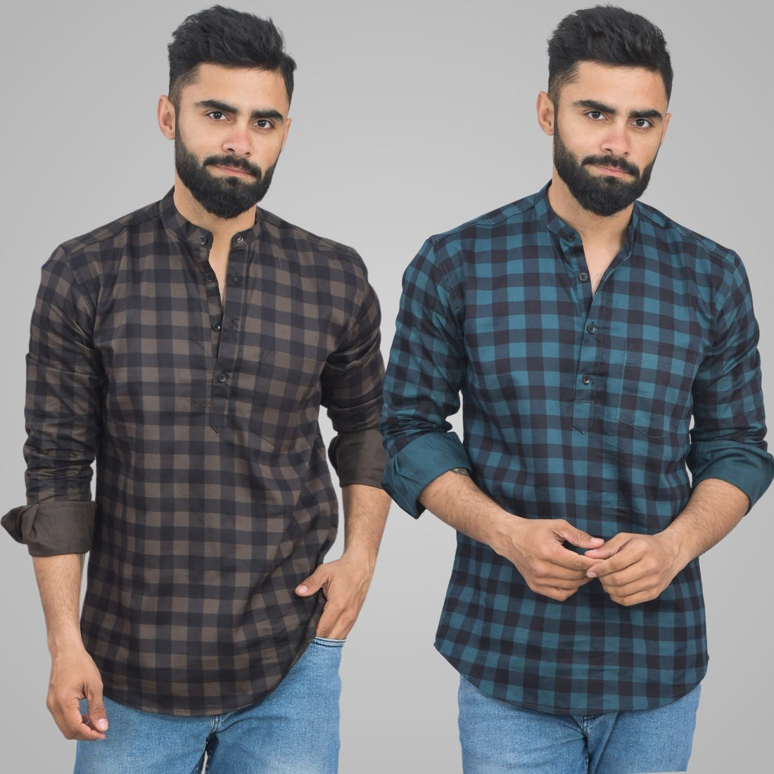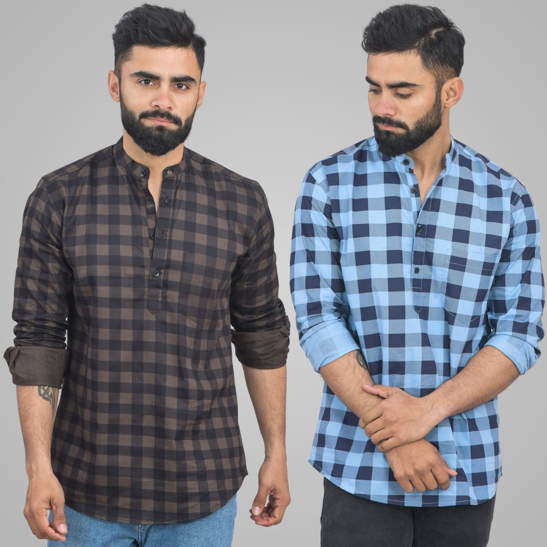 Pack Of 2 Mens Coffee And Ocian Blue Check Cotton Short Kurta Combo