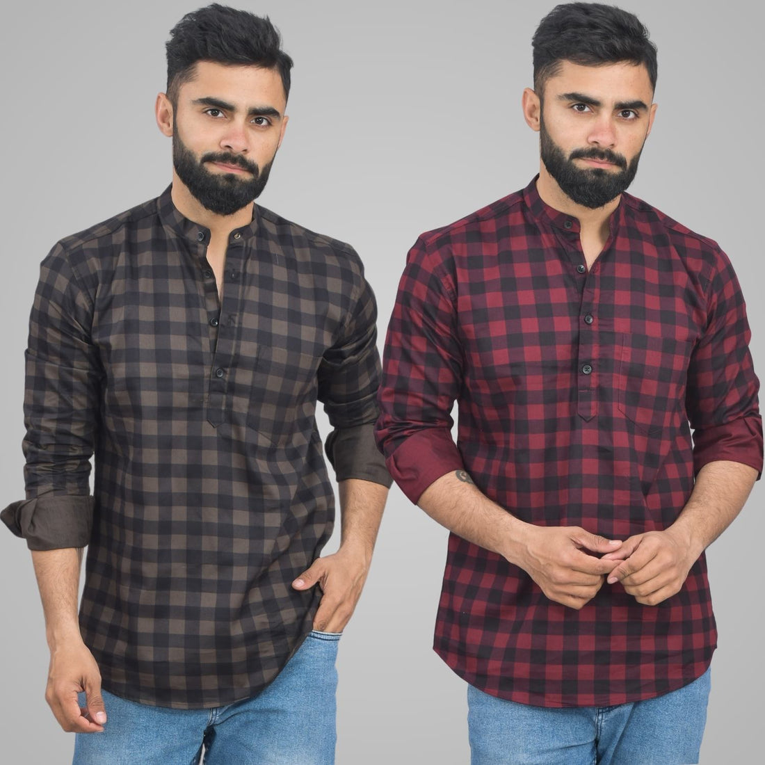 Pack Of 2 Mens Coffee And Red Check Cotton Short Kurta Combo