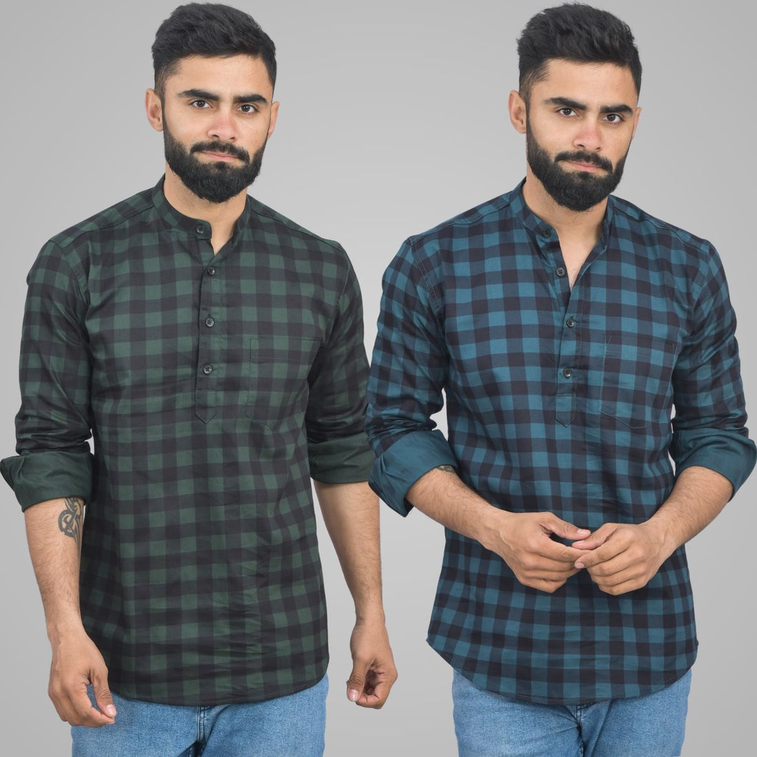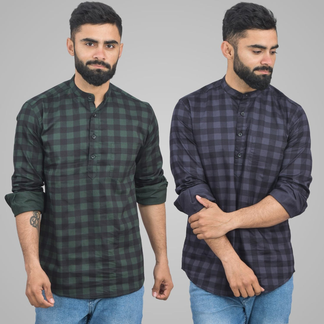 Pack Of 2 Mens Green And Grey Check Cotton Short Kurta Combo