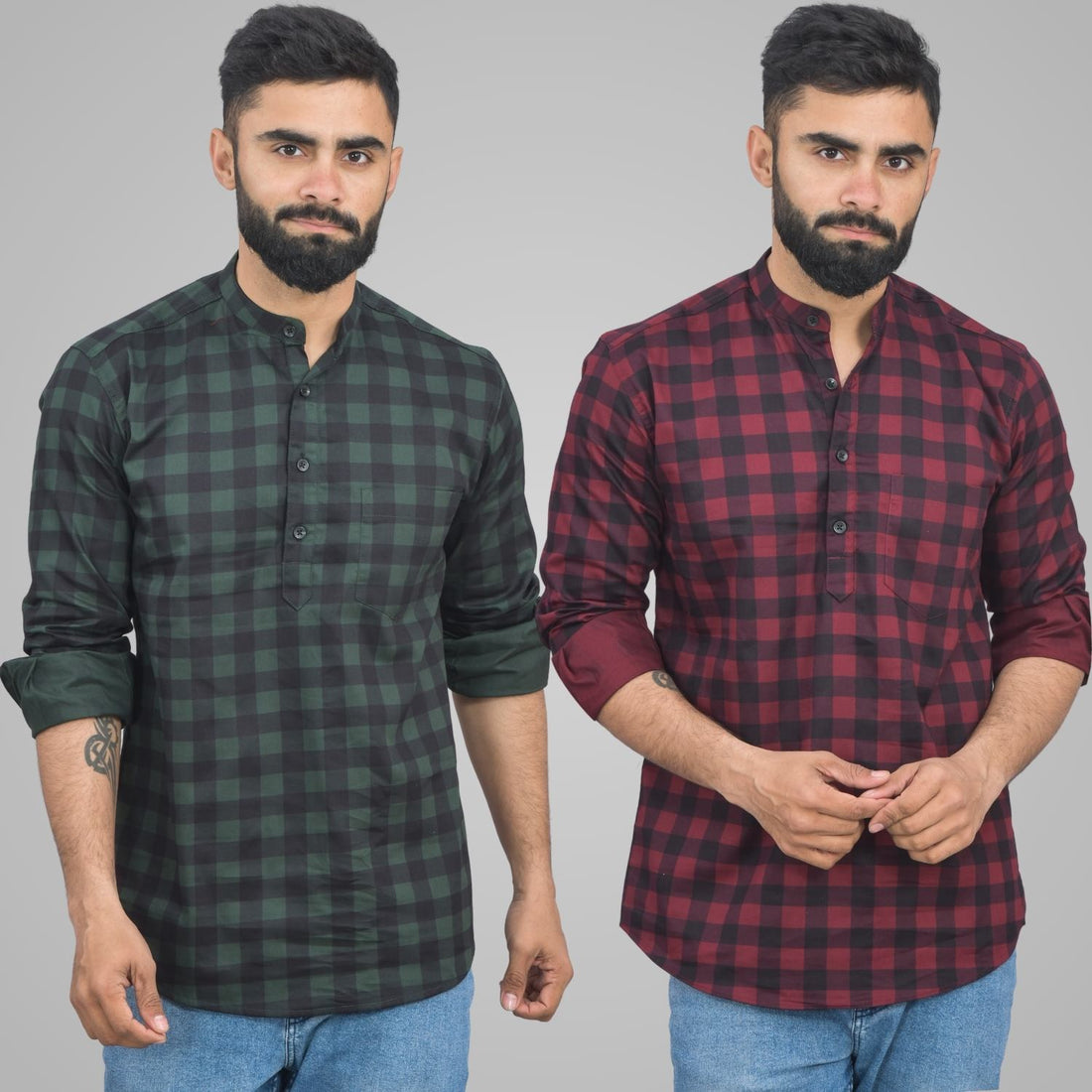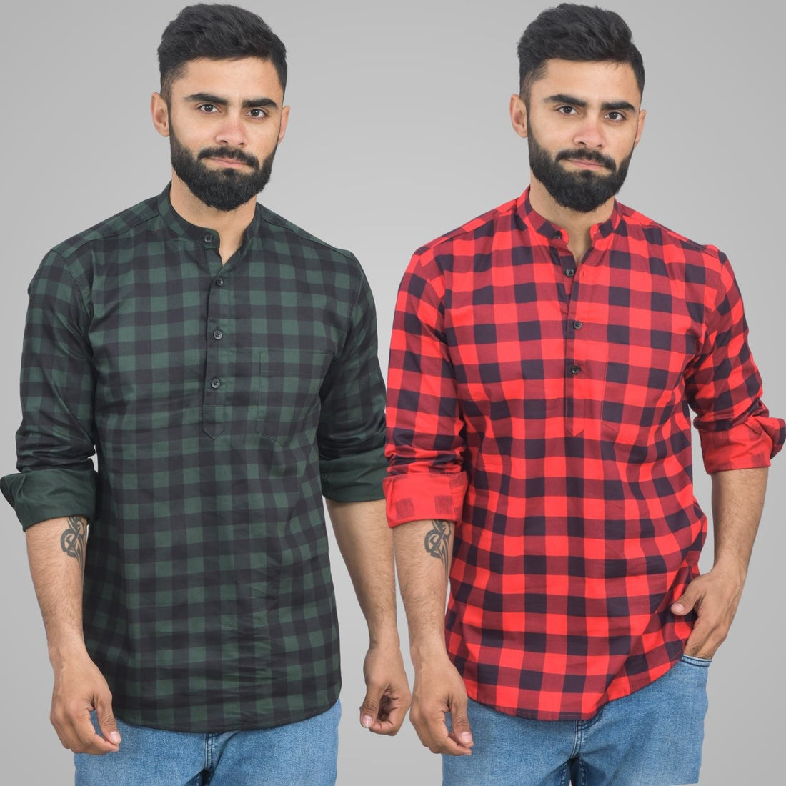 Pack Of 2 Mens Green And Red Check Cotton Short Kurta Combo