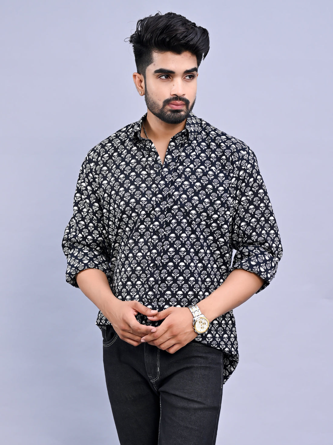Jaipuri Sanganeri Black Block Printed Cotton Shirt For Men