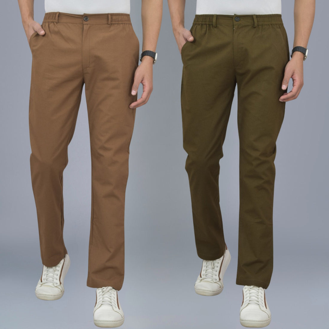 Pack Of 2 Brown And Mehendi Green Airy Linen Summer Cool Cotton Comfort Pants For Men