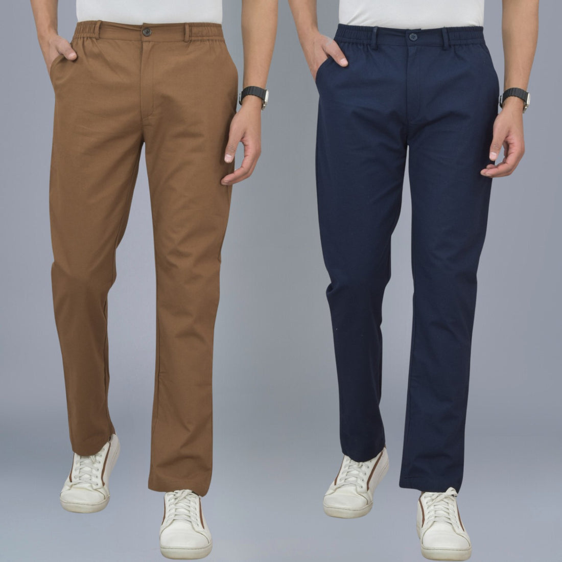 Pack Of 2 Brown And Navy Blue Airy Linen Summer Cool Cotton Comfort Pants For Men