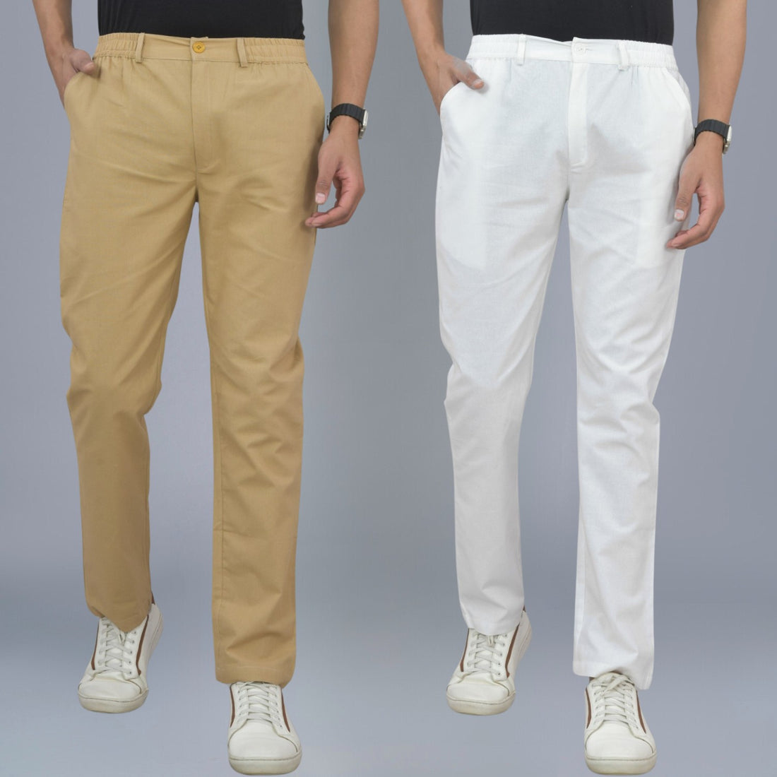 Pack Of 2 Beige And White Airy Linen Summer Cool Cotton Comfort Pants For Men