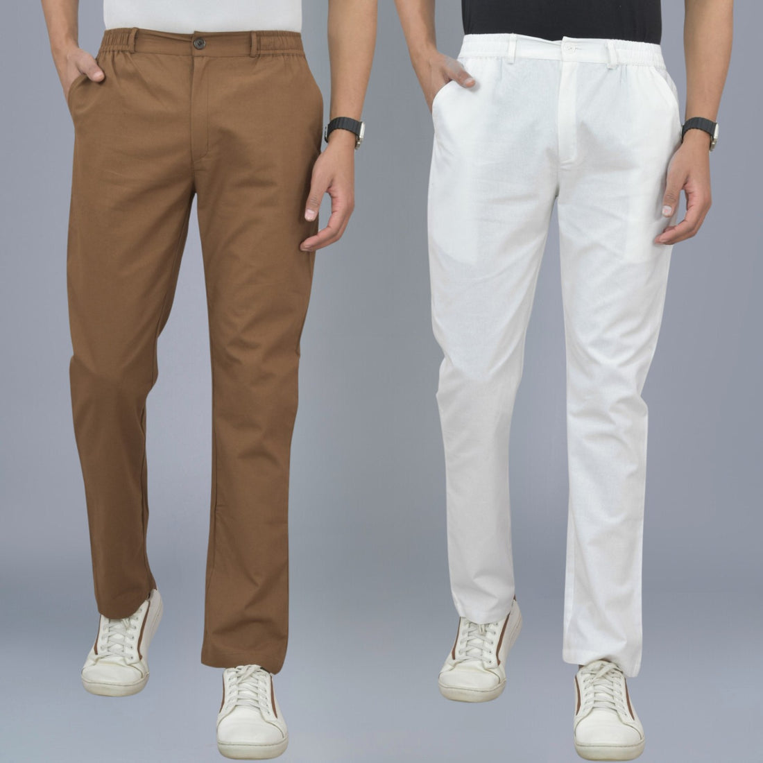 Pack Of 2 Brown And White Airy Linen Summer Cool Cotton Comfort Pants For Men