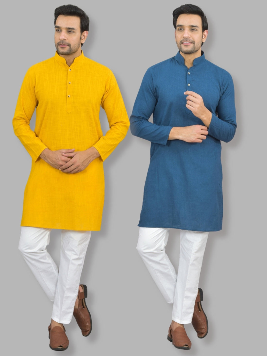 Mens Solid Mustard And Teal Blue Cotton Long Kurta Combo