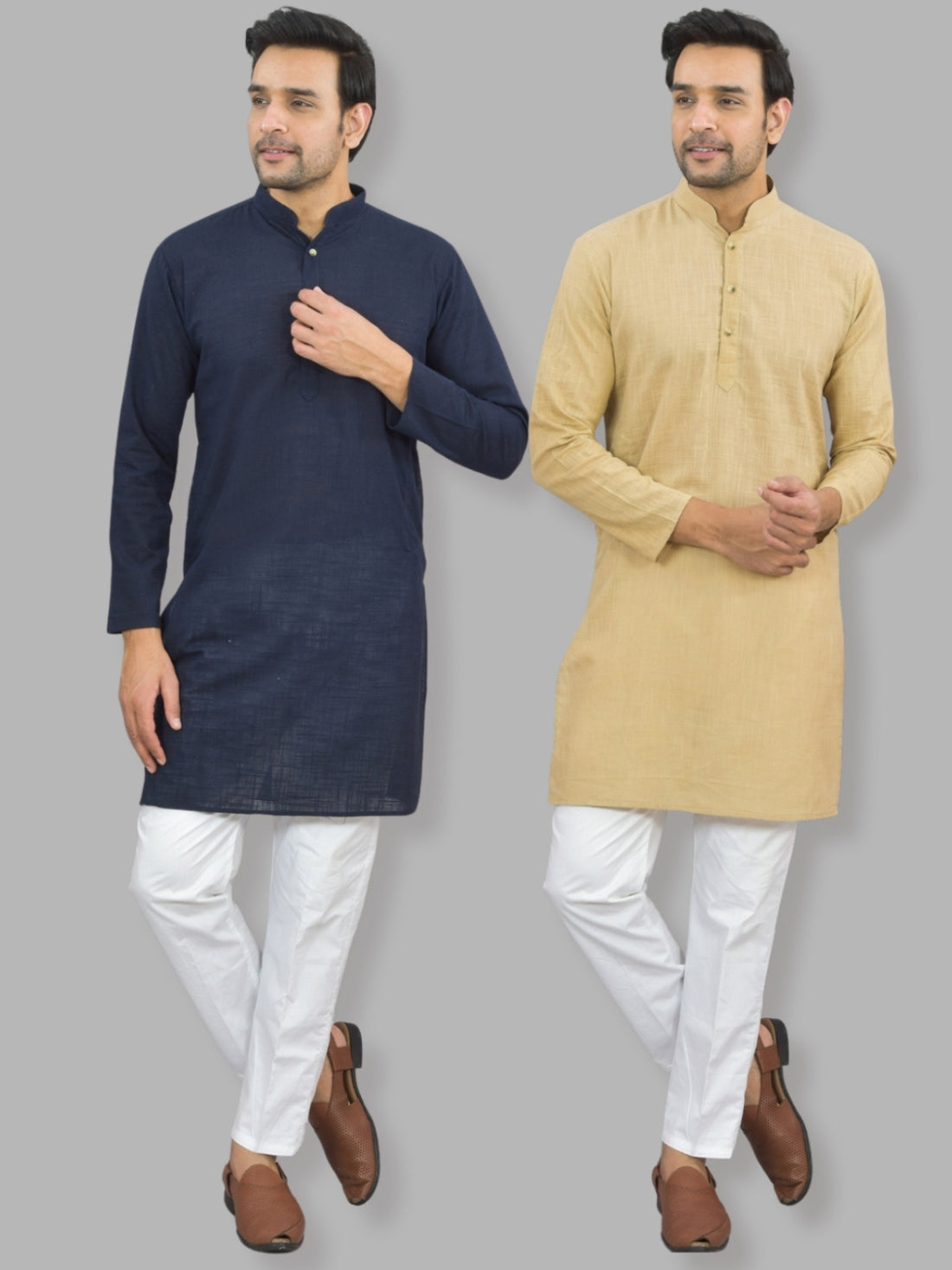 Mens Solid Navy Blue And Beige Cotton Long Kurta Combo