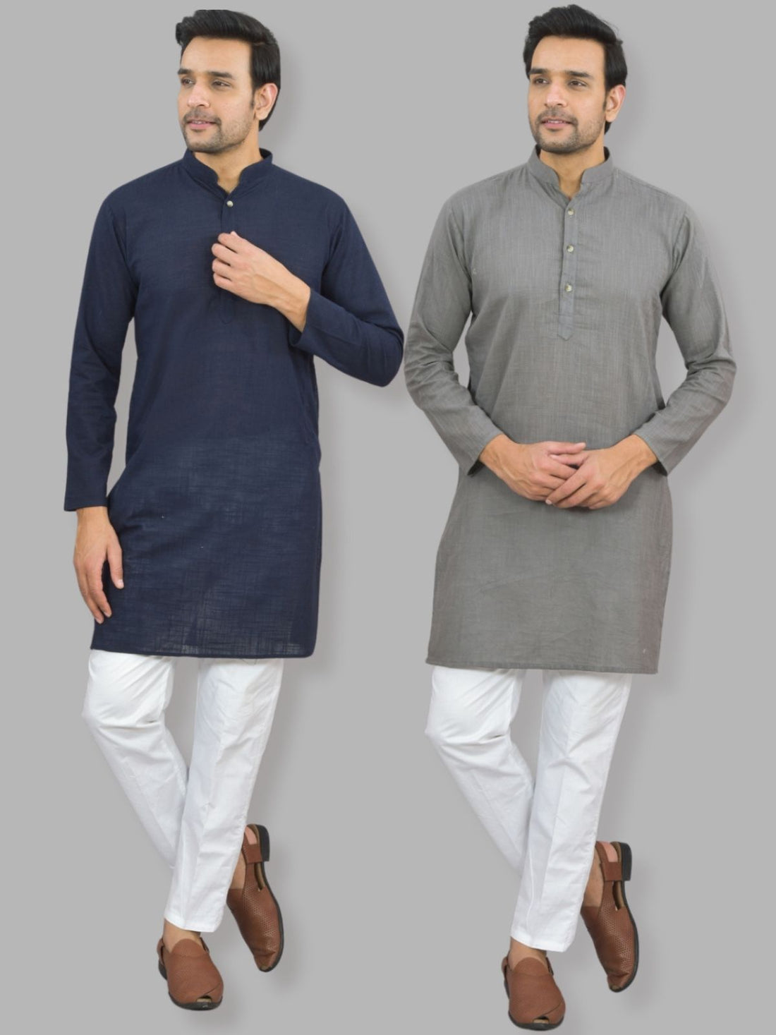 Mens Solid Navy Blue And Grey Cotton Long Kurta Combo