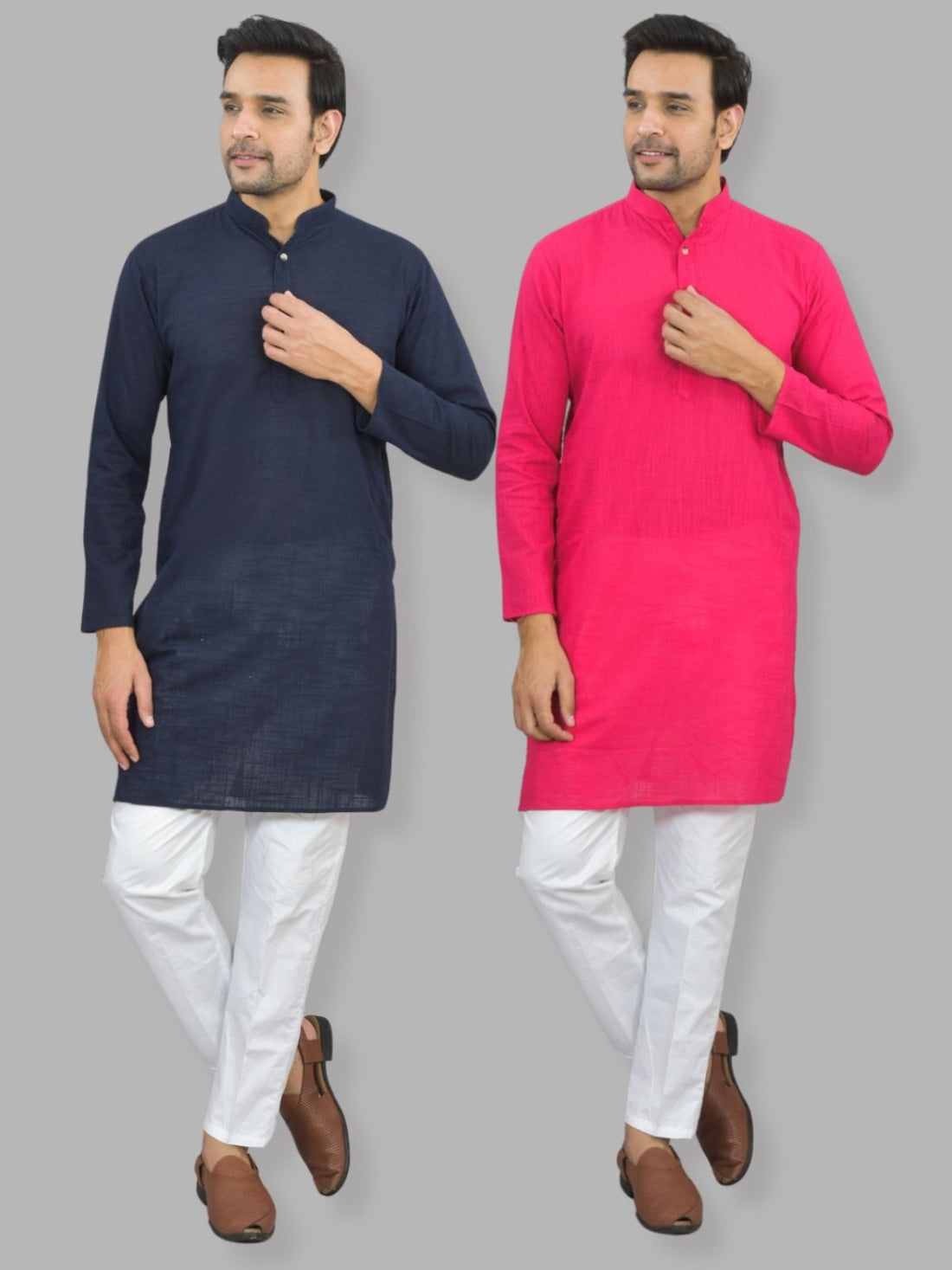 Mens Solid Navy Blue And Rani Cotton Long Kurta Combo