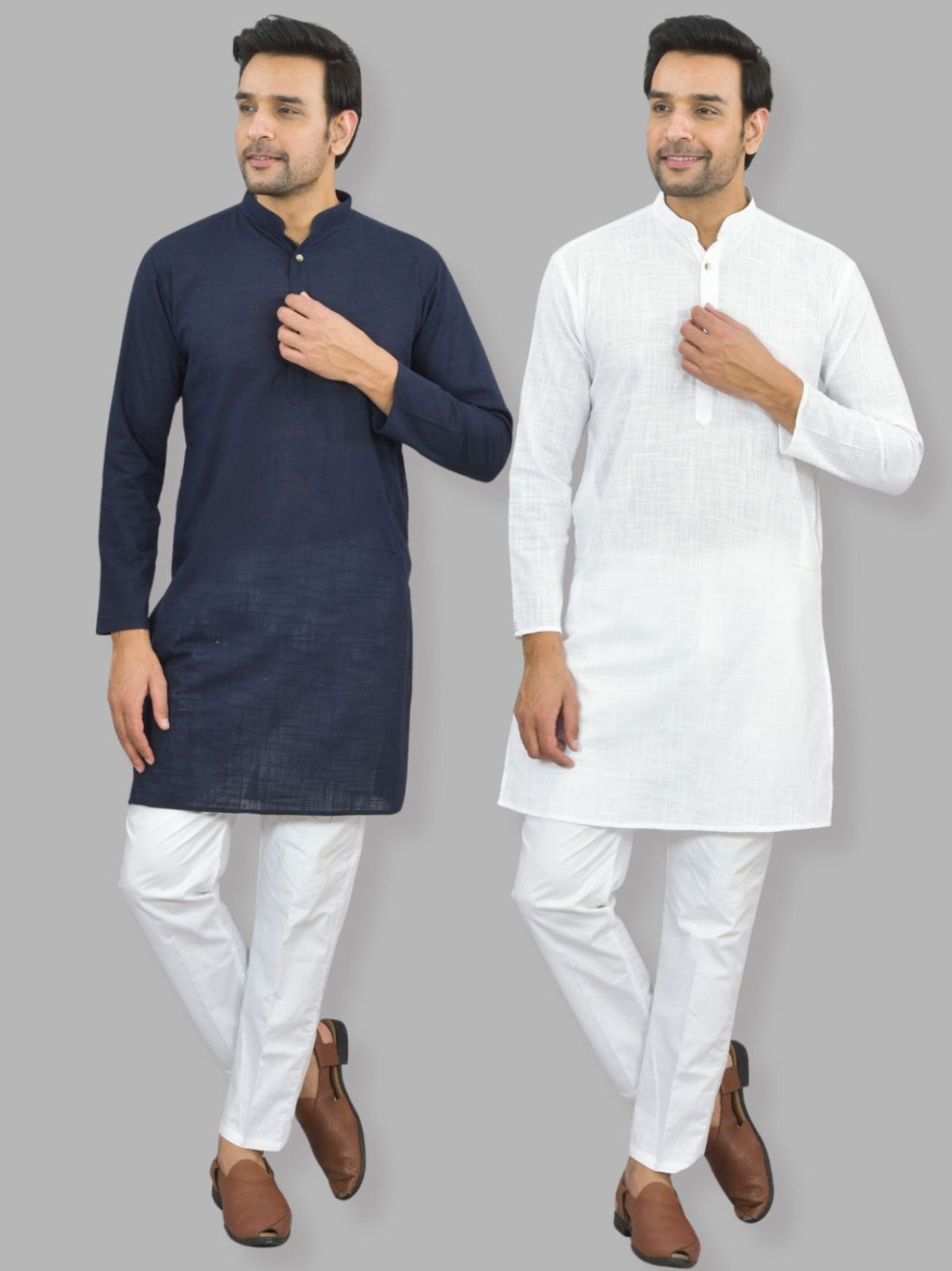 Mens Solid Navu Blue And White Cotton Long Kurta Combo
