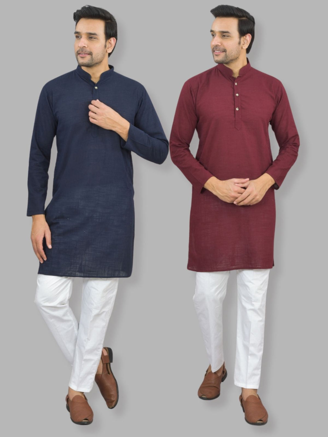 Mens Solid Navy Blue And Wine Cotton Long Kurta Combo