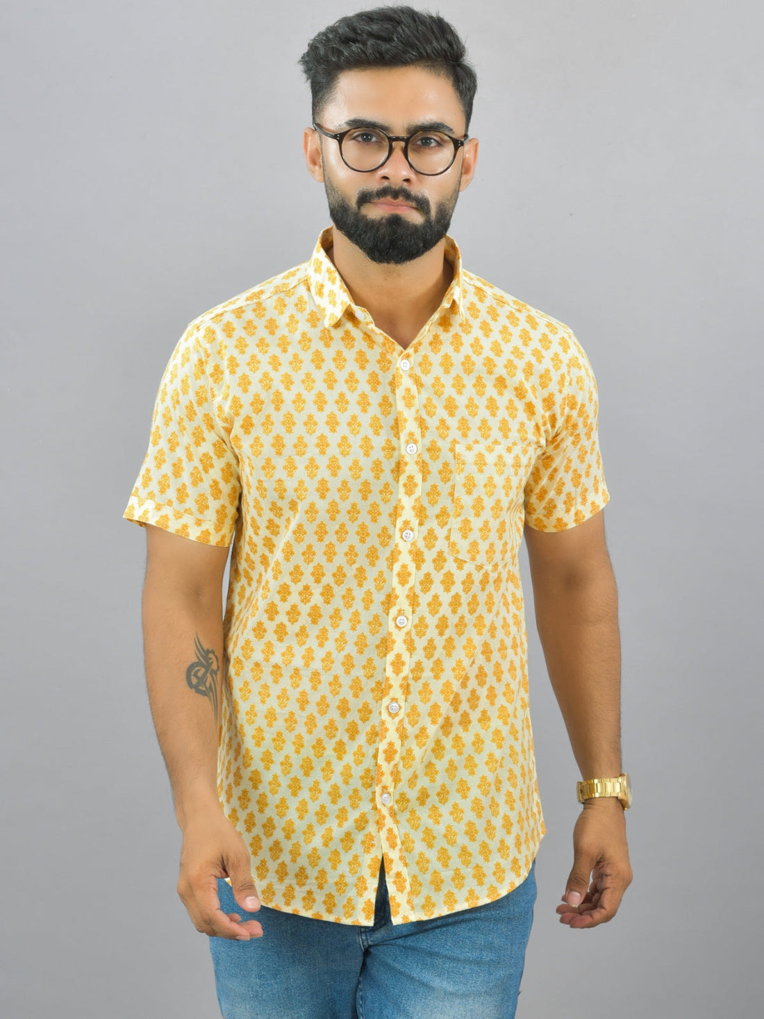 Mens Regualr Fit Half Sleeves Mustard Floral Printed Cotton Shirt