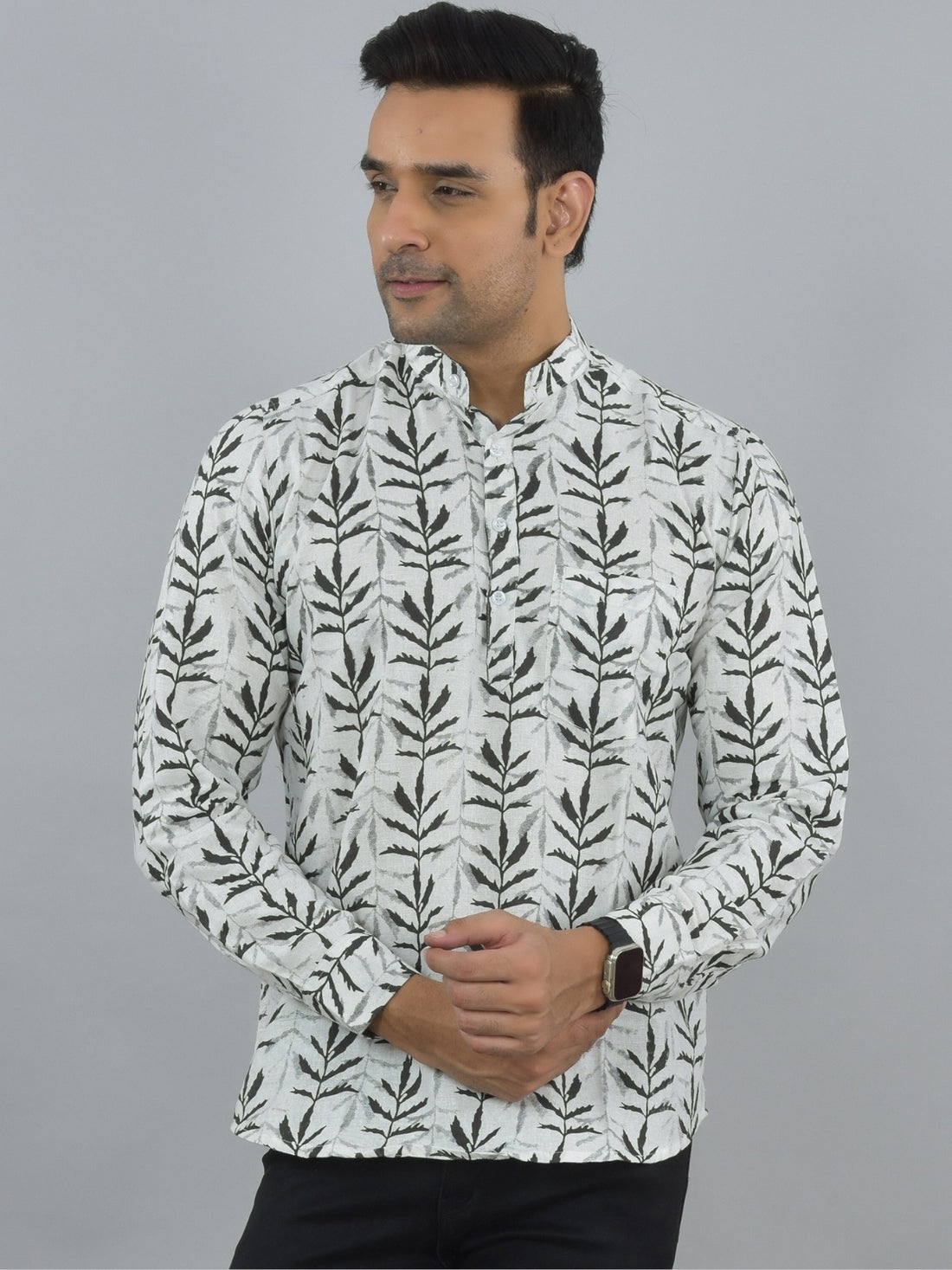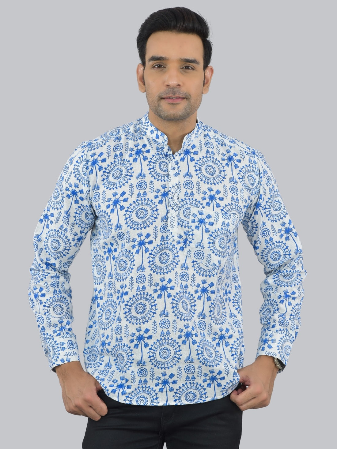 Look fashionable men's printed cotton short kurtas with zigzag, leaf, and tribal patterns. These full-sleeve...