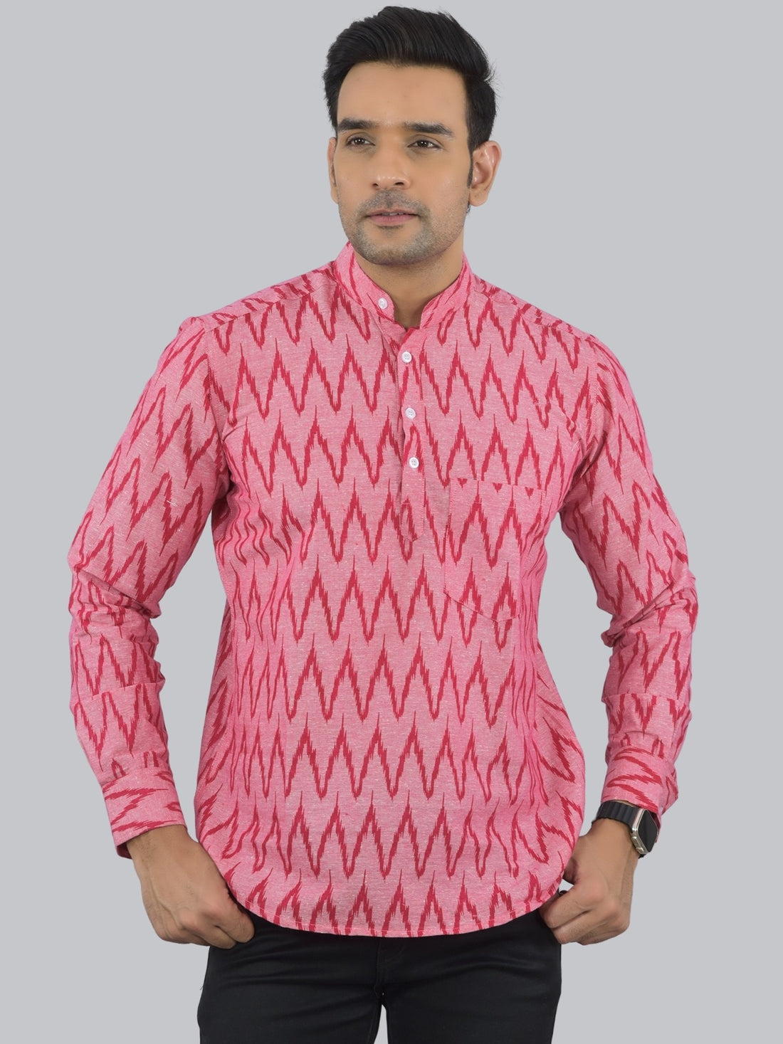 Regular Fit Pink Zig-Zag Printed Cotton Short Kurta