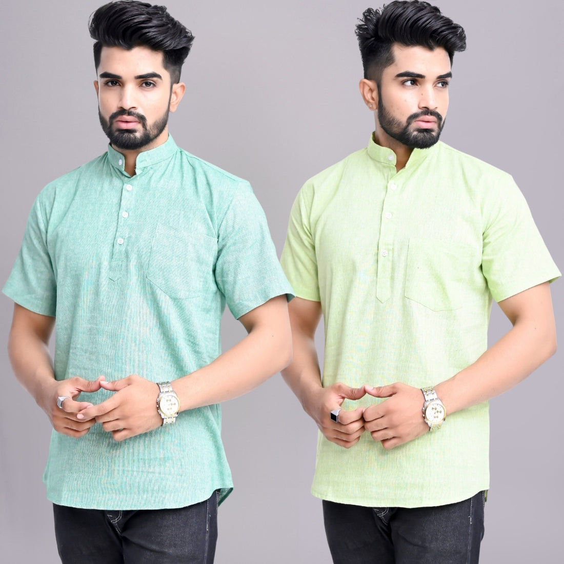 Pack of 2 Mens Solid Green And Parrot Green Khadi Cotton Short Kurta Combo