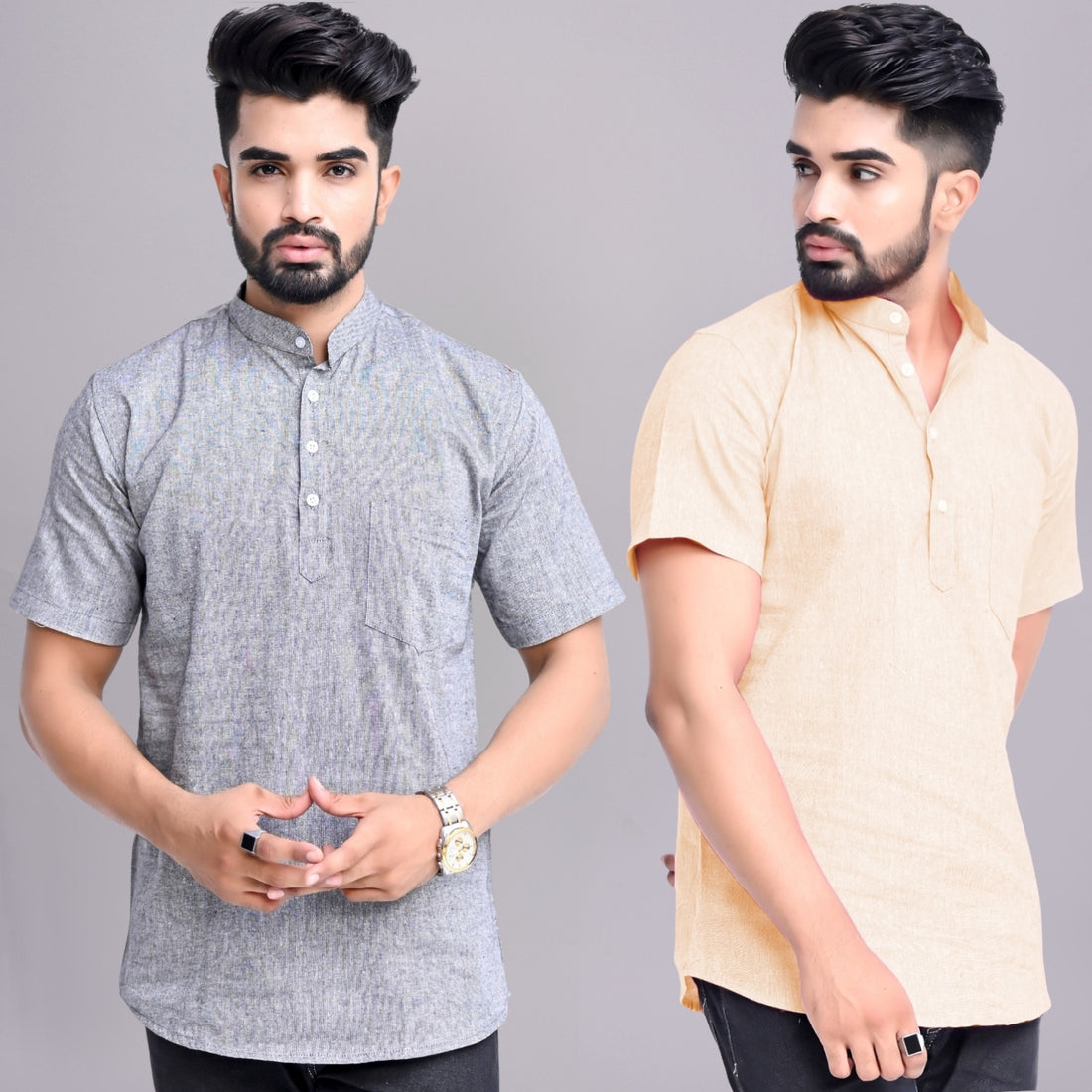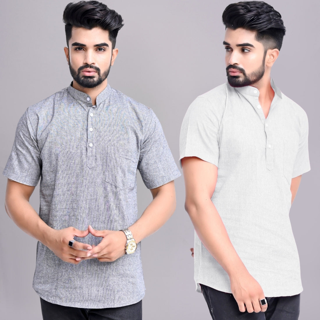 Pack of 2 Mens Solid Grey And Off White Khadi Cotton Short Kurta Combo