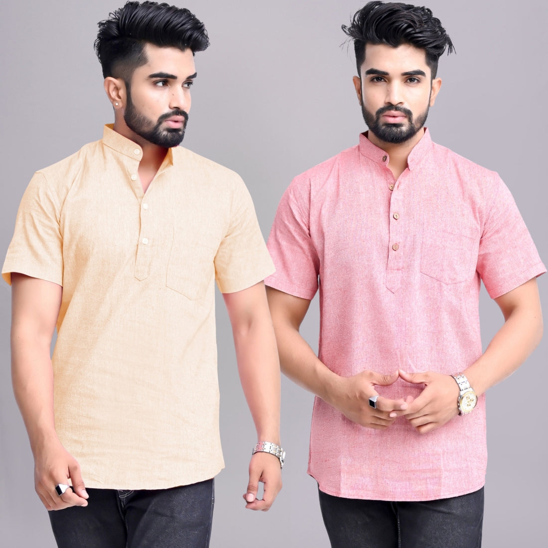 Pack of 2 Mens Solid Off White And Pink Khadi Cotton Short Kurta Combo
