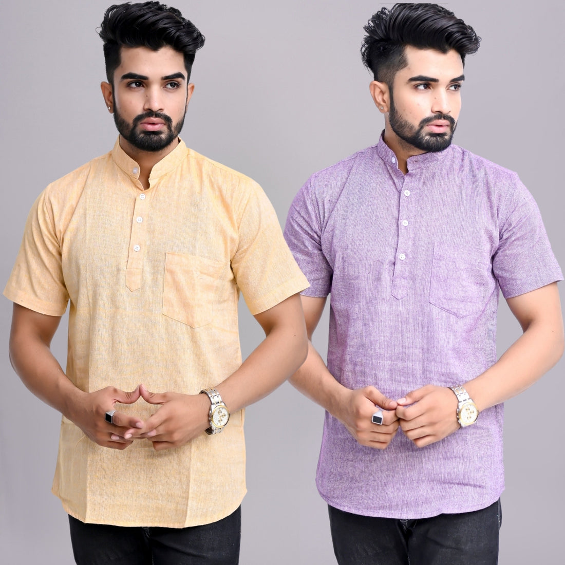 Pack of 2 Mens Solid Beige And Purple Khadi Cotton Short Kurta Combo