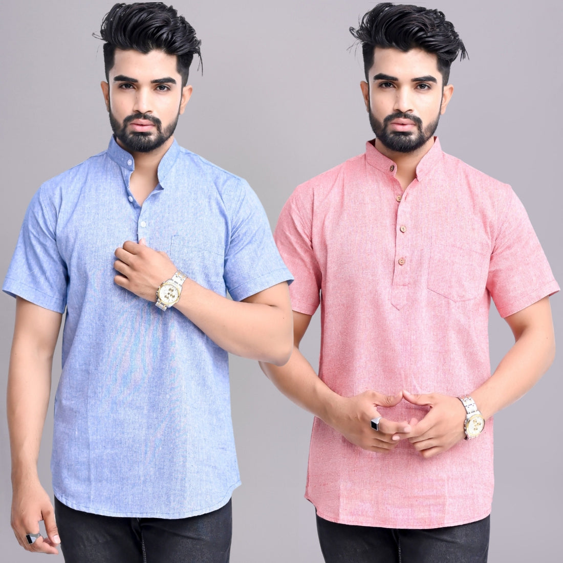Pack of 2 Mens Solid Blue And Red Khadi Cotton Short Kurta Combo