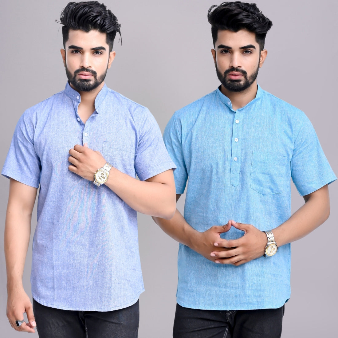 Pack of 2 Mens Solid Blue And Sky Blue Khadi Cotton Short Kurta Combo