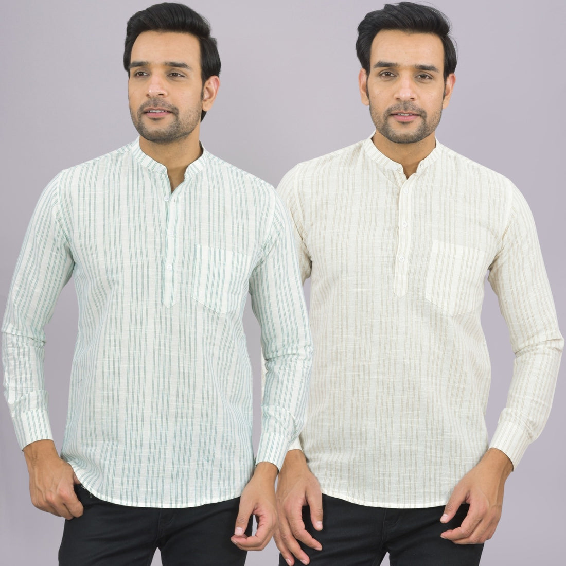 Our Pack of 2 Mens Multistriped Linen Slub Short Kurta will up your style score....