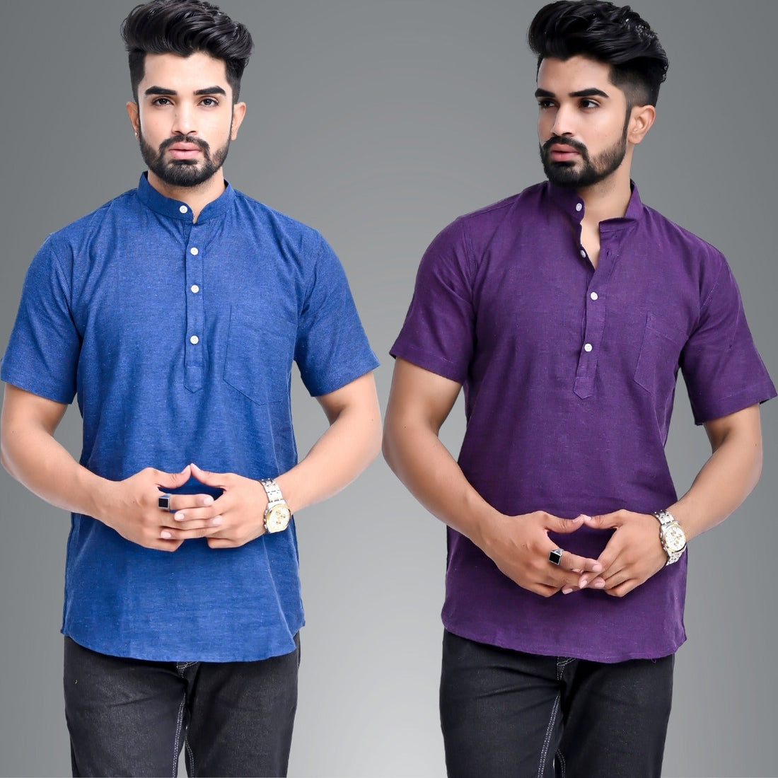 Mens Regular Fit Dark Blue and Dark Purple Half Sleeve Cotton Short Kurta Combo