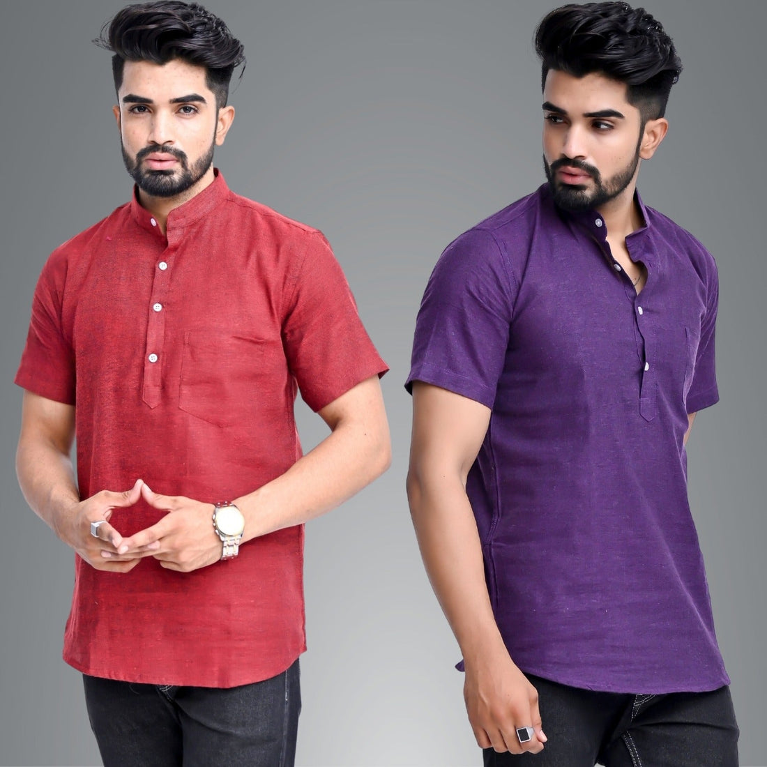 Mens Regular Fit Maroon and Dark Purple Half Sleeve Cotton Short Kurta Combo