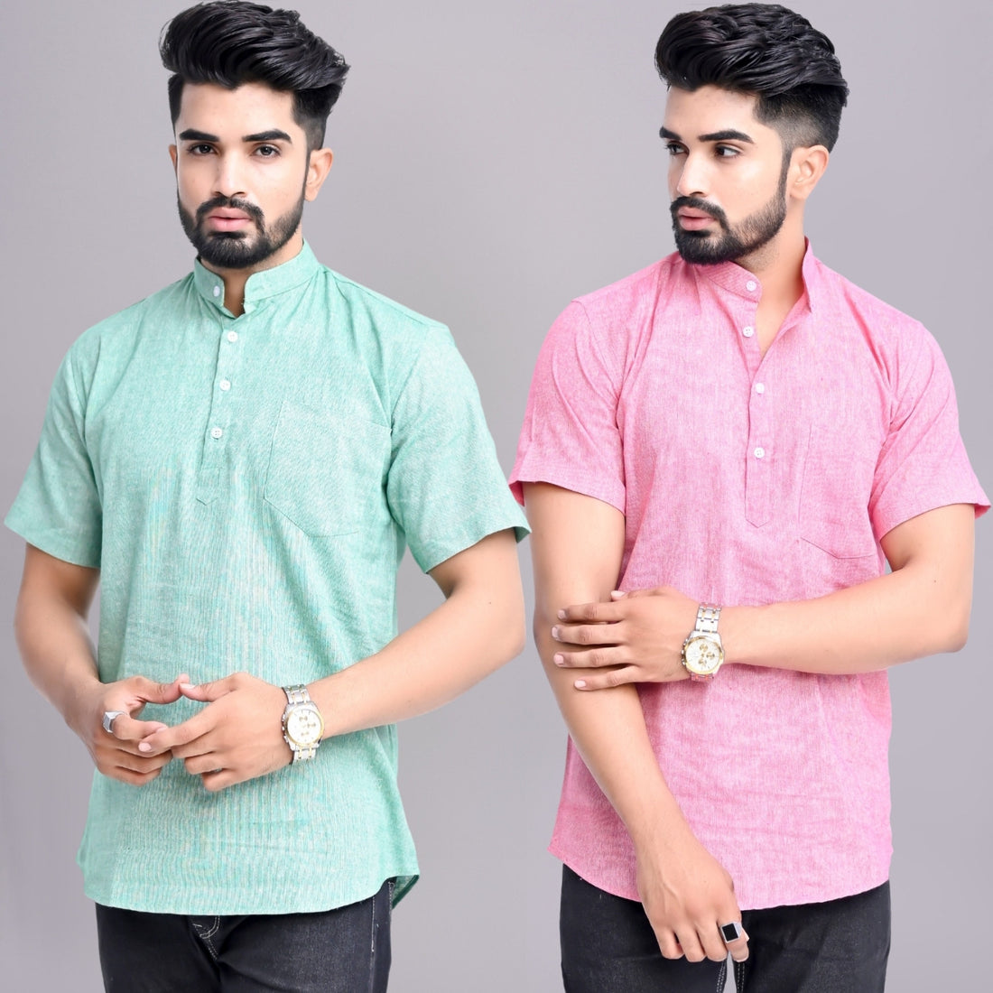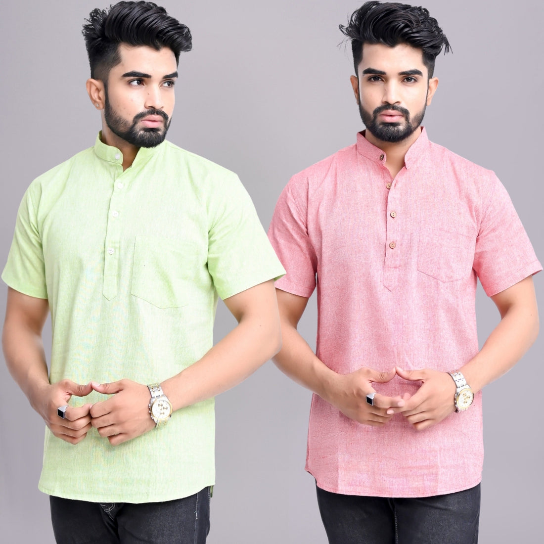 Pack of 2 Mens Solid Green And Pink Khadi Cotton Short Kurta Combo