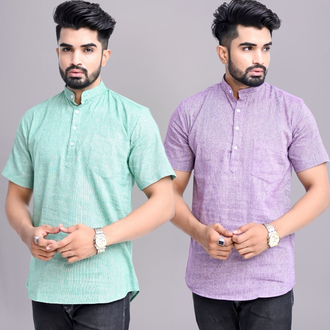Pack of 2 Mens Solid Green And Purple Khadi Cotton Short Kurta Combo