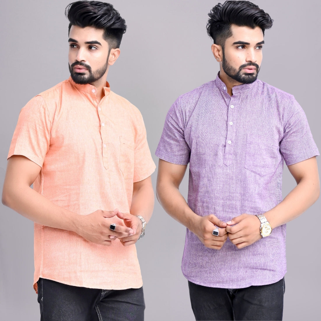 Pack of 2 Mens Solid Orange And Purple Khadi Cotton Short Kurta Combo